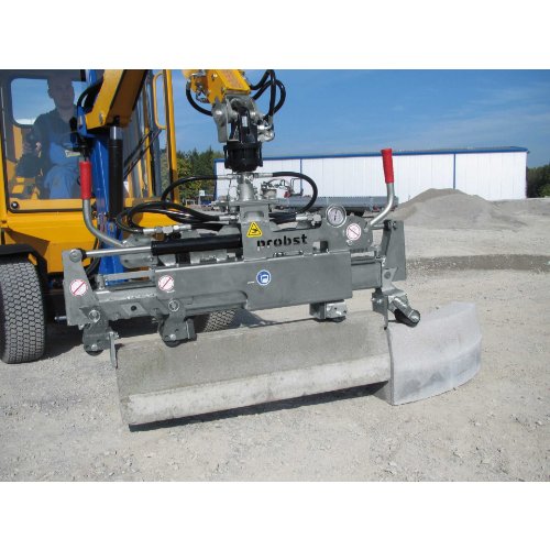 Mit dieser hydraulischen Universalzange lassen sich vielerlei Steinelemente im Straßen- und Tiefbau sowie im GaLaBau greifen und versetzen: unterschiedlich lange Bordsteine aus Beton oder Granit, Plattenelemente, Stufenelemente, Mauerscheiben, Natursteinblöcke.