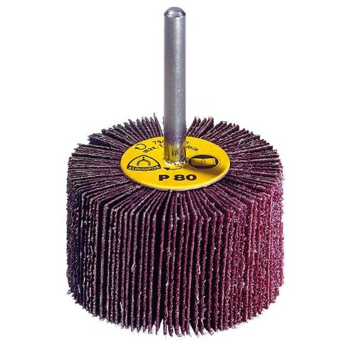 Schleifmop mit Schaft und Multibindung für handgeführte Maschinen zur Bearbeitung profilierter Werkstücke, Innenflächen, engen und schwer erreichbaren Stellen. Speziell für radialen, kühlen Schliff ohne Anlauffarben auf Edelstahl geeignet.