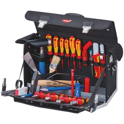 Bestückt mit 23 Markenwerkzeugen, teilweise VDE-geprüft nach DIN EN 60900. Leichte Ausführung aus strapazierfähigem, verstärktem Polyester-Gewebe. Vorderwand zusätzlich mit Aluminiumwinkeln verstärkt. Vorderwand teilweise aufklappbar mit verstellbaren Schlaufen und Dokumentenfach auf der Außenseite. Mit verzinkter Bodenschale. Mit Tragegriff und verstellbarem Schultergurt. Abmessungen, außen (B x H x T): 440 x 270 x 180 mm Abmessungen, innen (B x H x T): 420 x 250 x 160 mm.
