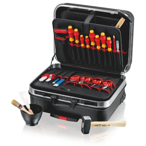 Bestückt mit sechs KNIPEX Werkzeugen, insgesamt 24 Markenwerkzeugen, teilweise VDE geprüft nach DIN EN 60900. Im Boden eingelassener Teleskopgriff sowie zwei außen liegende, leicht laufende Skater-Rollen. Zwei Metall-Kippschlösser und ein dreistelliges Zahlencodeschloss zum sicheren Verschließen des Deckels. Beschriftungsfeld mit zwei Aufklebern zur individuellen Kennzeichnung. Max. Zuladung: 20 kg. 33 Liter Fassungsvermögen. Stabiler, ergonomischer Tragegriff. Strapazierfähige Ausführung aus ABS-Material, schwarz. Umlaufender Aluminiumrahmen. Metallscharniere. Dokumentenfach im Deckel. Zwei herausnehmbare Werkzeugtafeln aus schmutzabweisenden PP-Hohlkammerplatten mit 31 bestückbaren Werkzeugtaschen. Erste Werkzeugtafel mit zehn Werkzeugtaschen und einer elastischen Schlaufe auf der Deckelseite und elf schmalen und einer großen Werkzeugtasche auf der Bodenseite. Zweite Werkzeugtafel mit zehn schmalen Werkzeugtaschen und einer elastischen Schlaufe auf der Bodenseite und einem Dokumentenfach auf der Deckelseite. Bodenschale, per Druckknopf fixierbar, Höhe 70 mm, durch Einsätze weiter unterteilbar und Abdecktafel mit 14 großen Werkzeugtaschen. Insgesamt 54 Steckmöglichkeiten.
