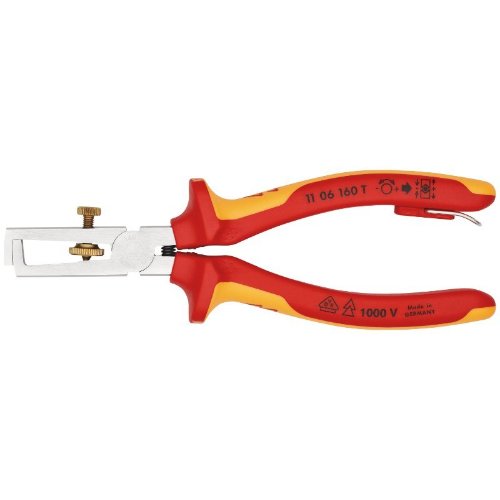 Für ein-, mehr- und feindrähtige Leiter mit Kunststoff- oder Gummiisolation max. Ø 5 mm oder 10 mm² Leiterquerschnitt. Einfache Verstellung auf den gewünschten Draht- oder Litzendurchmesser durch Rändelschraube und Kontermutter. Zange mit integrierter isolierter Befestigungsöse zum Anbringen einer Absturzsicherung.  Spezial-Werkzeugstahl, geschmiedet, ölgehärtet.