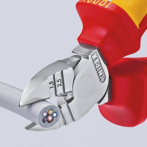 Mit langer Schneide. Hohe Schneidleistung durch Kraftgelenk. Präzisions-Abisolierlöcher für Leiter 1,5 und 2,5 mm². Komfortables Schneiden von NYM-Kabeln bis 5 x 2,5 mm². Lange Spitzen für feinste Schneidarbeiten auch unter beengten Verhältnissen. Induktiv gehärtete Präzisionsschneiden, Schneidenhärte ca. 60 HRC. Vanadin-Elektrostahl, geschmiedet, mehrstufig ölgehärtet.
