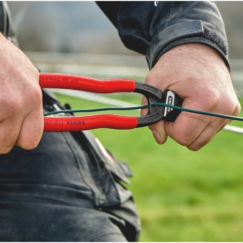 Für kraftvolles Schneiden auch größerer Querschnitte und sehr harter Materialien. Zweihandbedienung für maximale Schnittkraft. 60 % Kraftersparnis im Vergleich zu herkömmlichen Kraft-Seitenschneidern. 40-fache Handkraftverstärkung durch spezielle Gelenkkonstruktion. Mit Greiffläche unter dem Gelenk zum Greifen und Ziehen von Drähten ab Ø 1,0 mm. Induktiv gehärtete Präzisionsschneiden, Schneidenhärte ca. 64 HRC. Gerade Schneiden. Chrom-Vanadin-Hochleistungsstahl, geschmiedet, mehrstufig ölgehärtet.