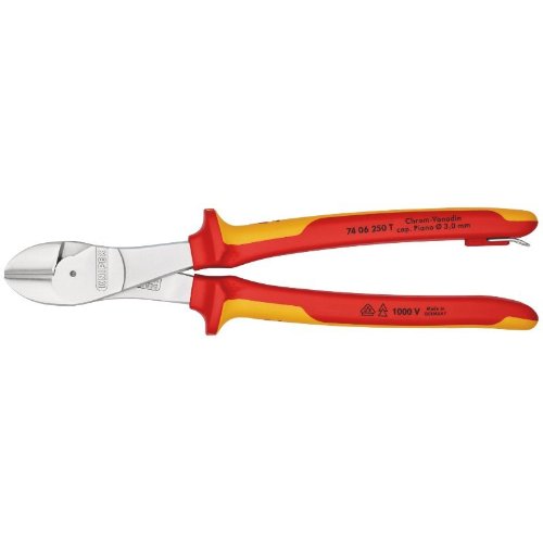 Für härteste, dauerhafte Beanspruchung. Hohe Schneidleistung bei geringem Kraftaufwand durch optimale Abstimmung von Schneidenwinkel und Übersetzungsverhältnis. Präzisionsschneiden zusätzlich induktiv gehärtet, (Schneidenhärte ca. 64 HRC) für alle Drahtsorten einschließlich Pianodraht. Zange mit integrierter isolierter Befestigungsöse zum Anbringen einer Absturzsicherung. Chrom-Vanadin-Hochleistungsstahl, geschmiedet, mehrstufig ölgehärtet.