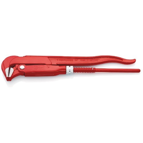 Schwedische Form. 90° abgewinkeltes Maul. Gegen die Drehrichtung versetzte Verzahnung. Verzahnung zusätzlich induktiv gehärtet. Doppel-T-Profilgriff. Unverlierbare Stellmutter. Rot pulverbeschichtet, Backen blank geschliffen. Chrom-Vanadin-Elektrostahl, geschmiedet, mehrstufig ölgehärtet.