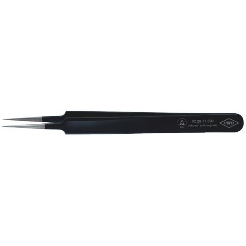 Chrom-/ Nickel-Stahl: rostfrei, antimagnetisch (18/10), sehr gängige Elektronik-Qualität. ESD-Beschichtung: blendfrei schwarz, mit einem Oberflächenwiderstand von ca. 10⁵ Ohm. Spitzen blendfrei gebürstet. Greifflächen mattiert für optimalen Halt. Nadelfeine Spitzen. Gerade Form. Greifflächen glatt. Chrom-Nickel-Stahl, rostfrei, antimagnetisch.