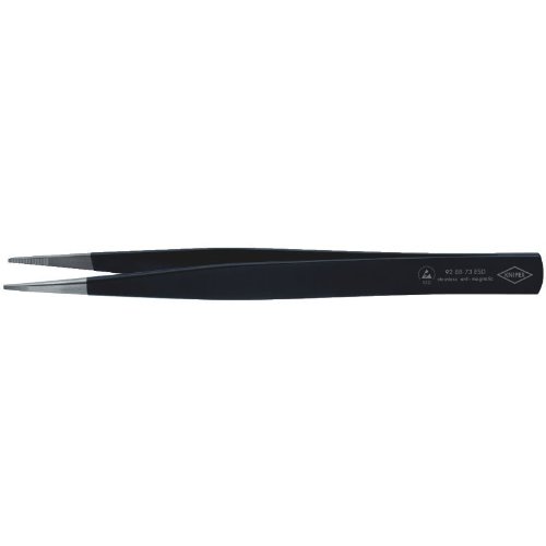 Chrom-/ Nickel-Stahl: rostfrei, antimagnetisch (18/10), sehr gängige Elektronik-Qualität. ESD-Beschichtung: blendfrei schwarz, mit einem Oberflächenwiderstand von ca. 10⁵ Ohm. Spitzen blendfrei gebürstet. Greifflächen mattiert für optimalen Halt. Eckige Spitzen, ca. 0,9 mm breit. Greifflächen fein gezahnt. Chrom-Nickel-Stahl, rostfrei, antimagnetisch.