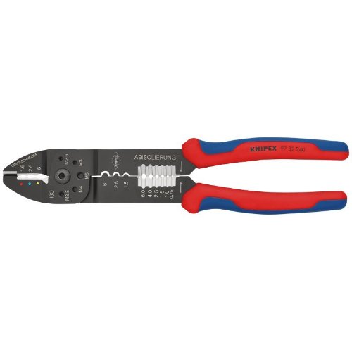 Zum Kabelschneiden, Abisolieren von Drähten und Crimpen von isolierten und unisolierten Kabelschuhen und Steckverbindern und offenen Steckverbindern. Mit Gewindelöchern zum Abschneiden von Cu- oder Ms-Gewindestiften mit M 2,6. M 3. M 3,5. M 4 und M 5. Geschraubtes Gelenk für eine hohe Stabilität und gleichmäßigen Lauf. Spezialstahl, hochfest.