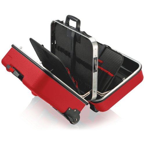 Strapazierfähige Ausführung aus ABS-Material, rot. Ausgestattet mit einem Sortiment KNIPEX-Werkzeuge für Arbeiten an elektrischen Anlagen, geprüft nach DIN EN/IEC 60900. Im Boden eingelassener Teleskopgriff sowie zwei außen liegende, leicht laufende Skater-Rollen. Frei stehend in allen Öffnungslagen durch beidseitig angebrachte, rastende Deckelhalter mit Scharniermechanik, Winkel frei einstellbar. Ein- oder beidseitig zu öffnen. Boden und Deckel lassen sich unabhängig voneinander öffnen. Max. Zuladung: 30 kg. 38 Liter Fassungsvermögen. Beschriftungsfeld mit zwei Aufklebern zur individuellen Kennzeichnung. Umlaufender Aluminiumrahmen mit fest montierter, stabiler, beidseitig bestückbarer Mittelwand, mit vielseitigen Einsteckmöglichkeiten durch elastische Schlaufen und zwölf kleinen Taschen. Metallscharniere. Dreistelliges Zahlenschloss zum sicheren Verschließen des Koffers. Je zwei Metall-Kippschlösser zur Fixierung des Deckels und des Bodens. Herausnehmbares Dokumentenfach und herausnehmbare Werkzeugtafel aus schmutzabweisenden PP-Hohlkammerplatten mit 13 Werkzeugtaschen. Bodenschale, per Druckknopf fixierbar, Höhe 58 mm, durch flexible Einsätze unterteilbar und Abdecktafel mit sechs großen Werkzeugtaschen. Abmessungen, außen (B x H x T): 520 x 435 x 290 mm Abmessungen, innen (B x H x T): 490 x 370 x 110/100 mm. IEC 60900, DIN EN 60900. Insgesamt 95 Steckmöglichkeiten.