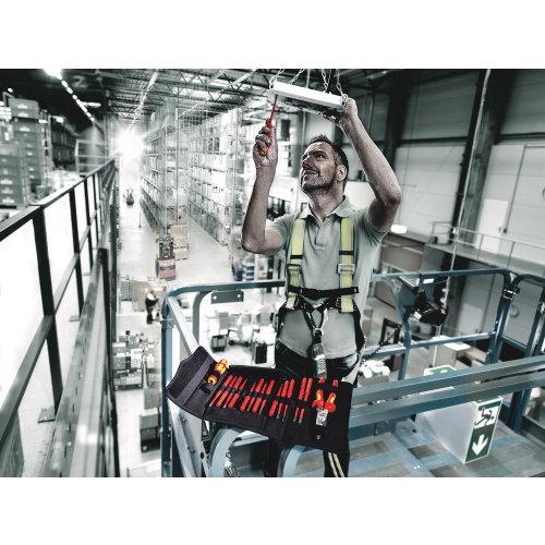 14 VDE-Wechselklingen (jeweils 154 mm lang) mit reduziertem Klingendurchmesser (Artikel KK 60 i 0,4x2,5 und KK 67 i TX 10 Standardklingendurchmesser), so dass auch tiefliegende Schraub- und Federelemente erreicht und betätigt werden können. 2 Handhalter 817 VDE für Wera VDE-Wechselklingen; Kraftform-Griff für ergonomisches Arbeiten; in robuster Gürteltasche. Stückgeprüfte Werkzeuge gem. IEC 60900 bei 10.000 V für sicheres Arbeiten bei der zugelassenen Spannung von 1.000 V. 1 Knipex Elektro-Installationszange VDE 13 96 200; die Zange ersetzt bis zu 6 Einzelwerkzeuge für die Elektroinstallation: Schneiden, Abisolieren, Greifen, Biegen, Entgraten und Crimpen – alles in einem Werkzeug. Mit Sperrklinke zum schonenden Greifen. Verchromt für besseren Rostschutz, mit isolierten Mehrkomponenten-Griffhüllen.