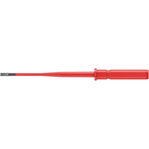 Wechselklinge mit reduziertem Klingendurchmesser mit integrierter Schutzisolation, so können tiefliegende Schraub- und Federelemente erreicht und betätigt werden. Stückgeprüfte Werkzeuge gem. IEC 60900. Stückprüfung im Wasserbad bei 10.000 V für sicheres Arbeiten bei der zugelassenen Spannung von 1.000 V.