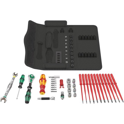 Kompaktes Werkzeug-Set mit den wichtigsten Schraubwerkzeugen für Wartungsarbeiten im Innen- und Außenbereich. Mit VDE Handhalter samt 12 VDE Klingen; 1 Joker Doppelmaulschlüssel mit Haltefunktion, Endanschlag, kleinem Rückholwinkel und extrem zupackenden Zähnen; mit der unglaublich schnellen 1/4" Knarre Zyklop Speed samt Zubehör; 8 Hand- und Maschinennüssen Größe 5,5-13, 1 Universalbithalter; 7 Bits (25 mm lang); 1 Schraubkralle zum Festhalten von Schrauben; textile Box mit sehr hoher Robustheit und Langlebigkeit; aufrecht positionierbar zur übersichtlichen Lagerung im Werkstattregal; zusätzlicher Oberflächenschutz durch textiles Außenmaterial; geringes Gewicht und Volumen für vereinfachte Mobilität.