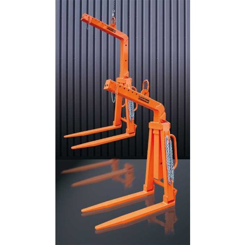 Stufenlos verstellbare Weite durch Spindelführung 540 - 900 mm und verstellbarer Nutzhöhe durch Absteckbolzen von 1150 – 1750 mm. Automatischer Gewichtsausgleich mit Stahlrollenführung im Oberteil. Lieferbar mit Sicherungskette, mit Schutzkorb oder Ladebox in Normalgröße oder in jeder gewünschten Sondergröße. Die angegebene Tragfähigkeiten gelten bei einem Abstand des Lastschwerpunktes von 680 mm vom Holm.