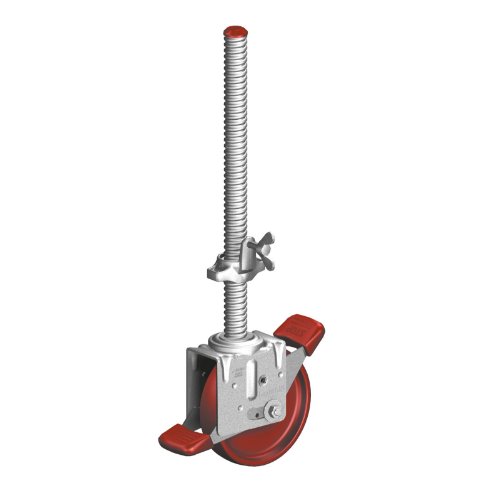 Spindelmutter mit Feststeller, Rolle mit Doppelbremshebel und Lastzentrierung in gebremsten Zustand.Zulässige Belastung: 10 kN (=1.000kg).