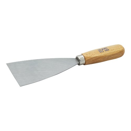 - Der Spachtel aus gehärtetem Werkzeugstahl, Spezialschliff, im vorderen Bereich flexibel.