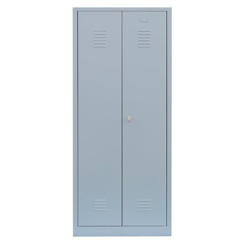 Mehrzweckspind mit 2 Abteilen, Abteilbreite 400 mm. Stabile, geschweißte Stahlblechkonstruktion. Türen mit Kastenverstärkung zur Aussteifung der Türblätter. Innenaufteilung links: 4 Fachböden. Innenaufteilung rechts: Hutboden mit Kleiderstange und 3 verschiebbaren Kunststoffhaken. Türen korpusbündig einschlagend, jeweils rechts und links angeschlagen, an gefederten Stiftscharnieren befestigt, geräuschdämpfende Anschlagspuffer. Türen mittig verschließbar durch Drehriegelverschluss für Vorhangschloss mit bis zu 5 mm Bügelstärke (nicht im Lieferumfang enthalten). Pulverbeschichtung: Korpus in RAL 7035 Lichtgrau, Türen in RAL 7035 Lichtgrau. GS-zertifiziert. Maße: H 1800 x B 800 x T 500 mm.