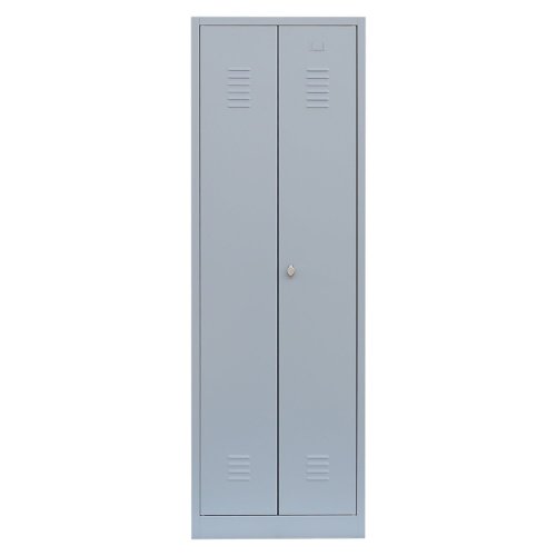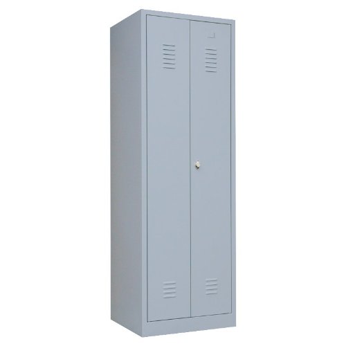 Mehrzweckspind mit 2 Abteilen, Abteilbreite 300 mm. Stabile, geschweißte Stahlblechkonstruktion. Türen mit Kastenverstärkung zur Aussteifung der Türblätter. Innenaufteilung links: 4 Fachböden. Innenaufteilung rechts: Hutboden mit Kleiderstange und 3 verschiebbaren Kunststoffhaken. Türen korpusbündig einschlagend, jeweils rechts und links angeschlagen, an gefederten Stiftscharnieren befestigt, geräuschdämpfende Anschlagspuffer. Türen mittig verschließbar durch Drehriegelverschluss für Vorhangschloss mit bis zu 5 mm Bügelstärke (nicht im Lieferumfang enthalten). Pulverbeschichtung: Korpus in RAL 7035 Lichtgrau, Türen in RAL 7035 Lichtgrau. GS-zertifiziert. Maße: H 1800 x B 600 x T 500 mm.