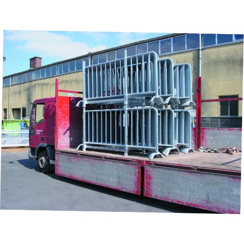 müba-Absperrgitterpalette zur Aufnahme von 15 schweren Absperrgitter 2,50 m (Nr. 19880), mit herausnehmbaren Holmen, verzinkt