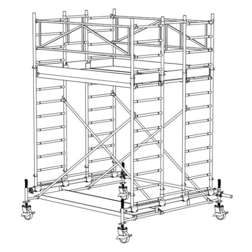 müba-Alu-Fahrgerüst Typ 200/2-250, Arbeitshöhe 4,65 m, Gerüsthöhe 3,75 m, Standhöhe 2,65 m, Standfläche 1,90 x 2,50 m, Belastung 2,0 kN/m², Aufbau- und Verwendungsanleitung beachten!