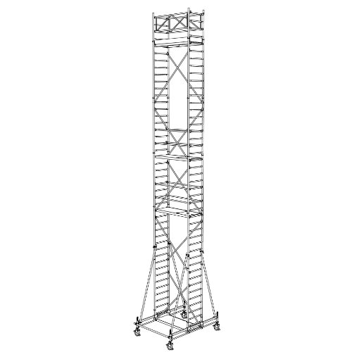 müba-Alu-Fahrgerüst Typ 70/10-180, Arbeitshöhe 12,65 m, Gerüsthöhe 11,75 m, Standhöhe 10,65 m, Standfläche 0,65 x 1,80 m, Belastung 2,0 kN/m², Aufbau- und Verwendungsanleitung beachten!