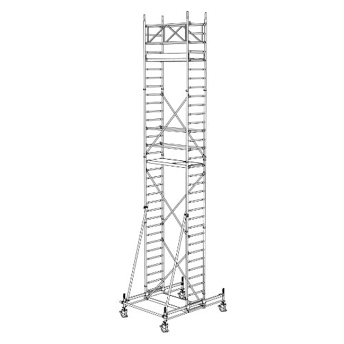 müba-Alu-Fahrgerüst Typ 70/7-180, Arbeitshöhe 9,65 m, Gerüsthöhe 8,95 m, Standhöhe 7,65 m, Standfläche 0,65 x 1,80 m, Belastung 2,0 kN/m², Aufbau- und Verwendungsanleitung beachten!