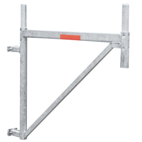 Außen-Verbreiterungskonsole 738 mm angekuppelt am Vertikalrahmen ergibt mit den entsprechenden Belägen eine Verbreiterung des Gerüstes um 87 cm. Es kann mit dem Vertikalrahmen um eine komplette Gerüstbreite nach außen oder innen versprungen werden.
