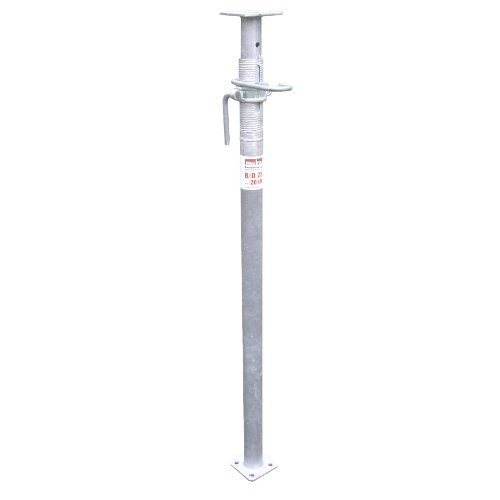 Baustütze mit Innengewinde, lackiert Nach DIN-Euro-Norm 1065 (Klasse BID), mit G-Haken für Grobeinstellungen in 10 cm Abstand, verzinktes Stützenschloss, Ausfallsicherung gegen Herausfallen des Innenrohrs, mit Flachkopf 140 x 140 x 8 mm.