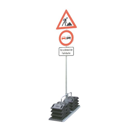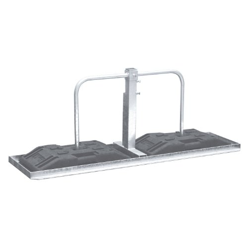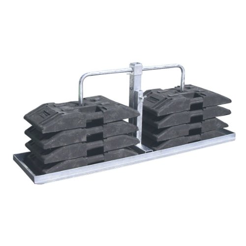 Der Fußplattenträger schwer kann 2 - 8 Fußplatten aufnehmen. Es ist eine Aufnahme für Schaftrohre 40 x 40 mm und eine Aufnahme für Rohre 60 x 60 mm vorhanden. Der Sicherungsbügel ist im Lieferumfang enthalten.