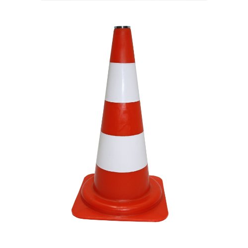 Pylonen Warnkegel in Leuchtrot mit zwei weißen, nicht reflektierenden Streifen. Mit Metallaufnahme für Scankugel.