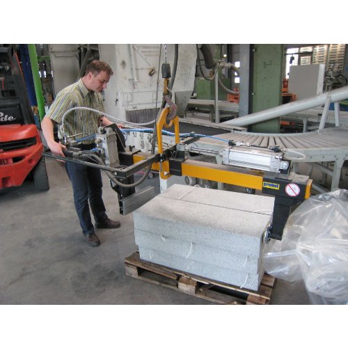 "Das Klammern und Drehen um die Längsachse erfolgt pneumatisch. Ermöglicht das Wenden von Betonprodukten, wie z.B. Trittstufen, Randwinkel, Bordsteine um 90° oder 180°. Einhängeöse für Kranhaken.