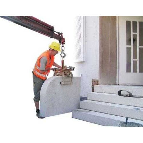 " Geeignet zum Greifen und Versetzen von Trittstufen, Bordsteinen, Randwinkeln und dergleichen mit einem Hebezeug. Einfache Öffnungsweitenverstellung mittels Federriegel.