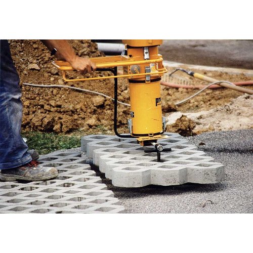 In diesem Fall dient dann die Vakuumenergie ausschließlich zum Anheben der Produkte, der Greifer erfasst die Produkte. Die Vorteile des Vakuums beim Heben und Senken, die stufenlose Steuerbarkeit der Geschwindigkeit, bleibt voll erhalten. Anstelle von Saugplatten können auch Greifer an Vakuum-Schlauchheber angebaut werden. Spezialzange zum Verlegen von alternativ 1, 2 oder 3 Rasengittersteine in einem Arbeitsgang Rasengitterversetzzange