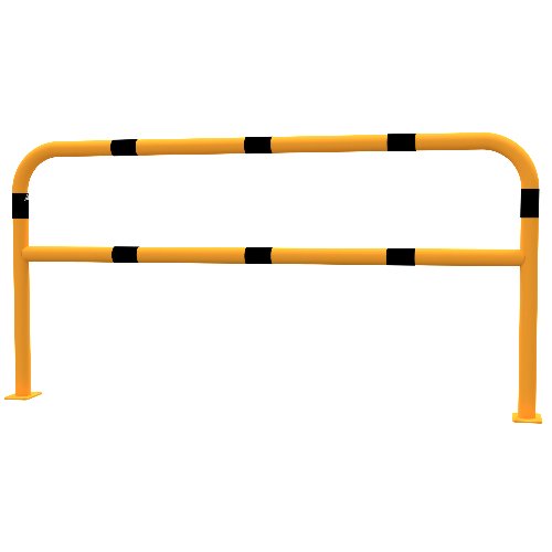 Der Abweisebügel besteht aus Stahlrundrohr mit 60 mm Durchmesser. Die Konstruktion misst 2000 mm in der Breite und 1000 mm in der Höhe. Ein Querholm verbindet die Ständer und erhöht die Aussteifung des Rahmens, wodurch die Form auch unter Belastung stabil bleibt. Die Oberfläche ist feuerverzinkt und anschließend gelb beschichtet; schwarze Warnstreifen erzeugen eine klare Kontrastwirkung. Die Verzinkung schützt das Rohr vor Korrosion, die farbige Beschichtung unterstützt die schnelle Erkennung im Umfeld und verbessert die visuelle Führung. Der Rohrquerschnitt ermöglicht eine feste, wenig nachgiebige Ausführung. Die rahmenartige Geometrie bildet eine physische Barriere, die Anfahr- und Streifkontakte aufnimmt und gut sichtbare Begrenzungen schafft. Mit 2000 mm Breite überspannt der Bügel größere Bereiche, 1000 mm Höhe schaffen eine deutlich erkennbare Abgrenzung im Blickfeld von Personen. Die Kombination aus mechanischer Stabilität, Korrosionsschutz und auffälliger Farbgebung eignet sich für eine dauerhafte Markierung und sichere Abgrenzung.