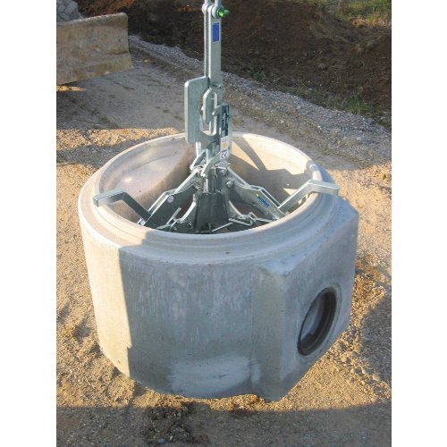 Mit dieser universellen Schachtversetzzange SVZ-UNI wird der Transport und das Versetzen von Schachtelementen enorm rationalisiert.
