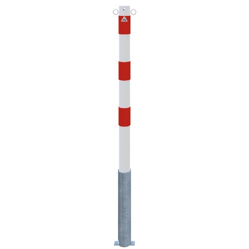 Absperrpfosten aus Stahlrohr für die klare Kennzeichnung und Sperrung von Flächen. Das Rohr besitzt 60 mm Außendurchmesser und 2,5 mm Wandstärke, oben mit aufgeschweißter Stahlkappe geschlossen. Im eingebauten Zustand steht der Pfosten 900 mm über Flur. Er ist herausnehmbar und kommt ohne Verschluss aus. Die Aufnahme erfolgt über eine Bodenhülse Typ 460.10 mit etwa 400 mm Unterflur, die im Untergrund fixiert wird. Oberfläche feuerverzinkt und weiß beschichtet; drei rot reflektierende Leuchtstreifen erhöhen die Sichtbarkeit bei Tag und Nacht. Zwei Ösen am Pfosten ermöglichen die Befestigung zusätzlicher Sicherungselemente. Die Kombination aus Verzinkung und Beschichtung schützt den Stahl vor Witterungseinflüssen. Der Pfosten wird in die Bodenhülse eingesetzt und kann bei Bedarf wieder entnommen werden, etwa zur kurzfristigen Freigabe. Die farbliche Ausführung mit Reflexmarkierung unterstützt eine eindeutige Signalwirkung, auch bei ungünstigen Lichtverhältnissen und aus größerer Entfernung.