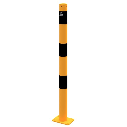 Der ortsfeste Absperrpfosten dient der klaren Abgrenzung und Kennzeichnung von Verkehrs- und Betriebsflächen. Er besteht aus einem Stahlrohr mit 60 mm Durchmesser und 2,5 mm Wandstärke und ist oben mit einer aufgeschweißten Stahlkappe abgeschlossen, sodass keine offene Rohrkante bleibt. Die Überflurhöhe von 900 mm sorgt für eine gut sichtbare Markierung in frequentierten Bereichen. Die Oberfläche ist feuerverzinkt und gelb beschichtet; drei schwarze Streifen erhöhen die optische Erkennbarkeit. Die Verzinkung schützt vor Korrosion und erlaubt den Einsatz im Außenbereich. Die Montage erfolgt als Dübelbefestigung über die 100 x 150 mm große Bodenplatte auf einem tragfähigen Untergrund. Der Pfosten wird dauerhaft verschraubt und verbleibt am Standort. Die Ausführung ohne Öse ist für Absperrungen ohne Ketten- oder Gurtführung vorgesehen. Mit seinem schlanken Rohrquerschnitt beansprucht der Pfosten wenig Fläche und schafft zugleich eine klare visuelle Begrenzung, etwa an Zufahrten, Stellflächen, Wegen oder in Arbeitsbereichen.