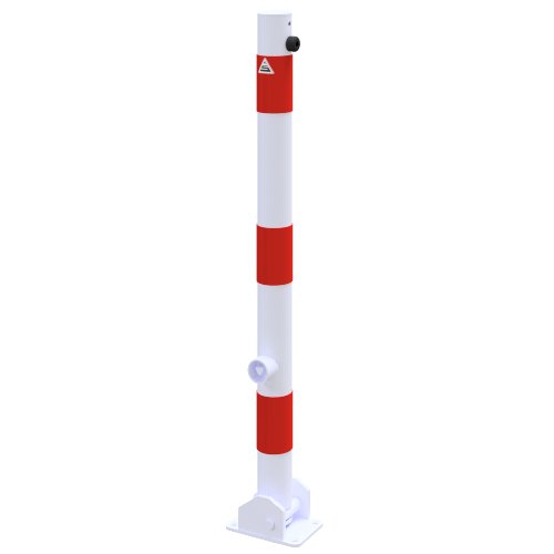 Der umlegbare Absperrpfosten aus Stahlrohr mit Ø 60 mm und 2,5 mm Wandstärke sperrt Zufahrten, Parkflächen und Wege ab und lässt sich bei Bedarf flachlegen. Die Überflurhöhe beträgt 900 mm. Eine aufgeschweißte Stahlkappe schließt das Rohr oben ab. Die Verriegelung erfolgt über einen Dreikantverschluss nach DIN 3223 mit selbsteinrastender Mechanik; das Öffnen und Schließen erfolgt mit Dreikantschlüssel. Der Pfosten ist für die Dübelbefestigung ausgelegt und besitzt eine Bodenplatte 100 x 150 mm zur Montage auf Beton oder anderen tragfähigen Untergründen. Die Oberfläche ist feuerverzinkt und weiß beschichtet; drei rot reflektierende Leuchtstreifen erhöhen die Sichtbarkeit im Tages- und Nachtbetrieb. Die Ausführung kommt ohne Öse. Materialstärke und Korrosionsschutz sind auf den Einsatz im Freien ausgelegt, etwa an Betriebszufahrten, Besucherparkplätzen oder auf Werksgeländen.