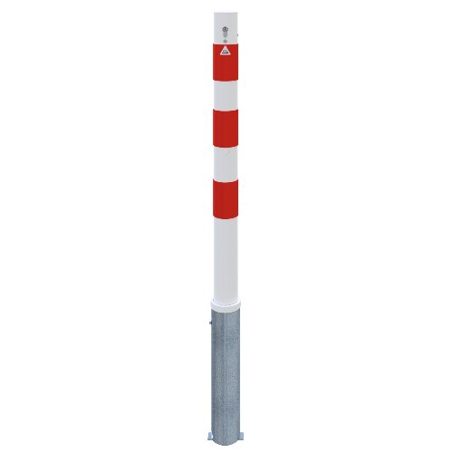 Der herausnehmbare Absperrpfosten besteht aus einem Stahlrohr mit 76 mm Durchmesser und 2,6 mm Wandstärke. Eine aufgeschweißte Stahlkappe schließt das Rohr oben ab. Das sichtbare Maß beträgt 900 mm über Flur, sodass der Pfosten klar wahrnehmbar im Verkehrsraum steht. Der Pfosten wird in die Bodenhülse Typ 476.40 eingesetzt; die Einbautiefe liegt bei etwa 400 mm Unterflur. Der Pfosten ist feuerverzinkt und weiß beschichtet; die Verzinkung schützt den Stahl vor Korrosion. Drei umlaufende, rot reflektierende Leuchtstreifen erhöhen die Sichtbarkeit bei Dunkelheit und in Schlechtwetterphasen. Die Sicherung erfolgt über ein integriertes Profilzylinderschloss mit selbsteinrastender Verriegelung, drei Schlüssel sind im Lieferumfang enthalten. Nach dem Einsetzen rastet der Pfosten selbsttätig ein und wird bei Bedarf per Schlüssel entriegelt, um ihn komplett herauszunehmen. Diese Ausführung wird ohne Öse geliefert und ist daher nicht für Kettenanbindungen vorgesehen. Lieferung inklusive Bodenhülse und Profilzylinderschloss, Oberfläche Weiß mit roten Reflexstreifen.
