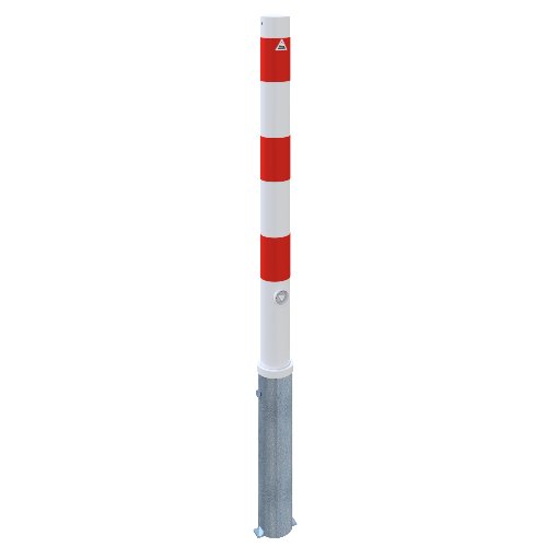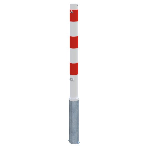 Dieser Absperrpfosten aus Stahlrohr mit 76 mm Durchmesser und 2,6 mm Wandstärke dient zur Absicherung und Regelung von Zufahrten, Parkflächen und betrieblichen Verkehrswegen. Die Überflurhöhe beträgt 900 mm; die aufgeschweißte Stahlkappe schließt das Rohr sauber ab. Der Pfosten ist herausnehmbar und wird über einen Dreikantverschluss nach DIN 3223 mit selbsteinrastender Verriegelung gesichert. Die Montage erfolgt in der Bodenhülse Typ 476.40, die ca. 400 mm im Untergrund sitzt. Für dauerhaften Korrosionsschutz ist der Pfosten feuerverzinkt und zusätzlich weiß beschichtet; drei rote, reflektierende Leuchtstreifen erhöhen die Erkennbarkeit bei Dunkelheit. Die Ausführung kommt ohne Öse aus und eignet sich überall dort, wo der Bereich bei Bedarf schnell freigegeben werden soll, etwa auf Betriebshöfen, vor Toren oder in Bereichen mit Lieferverkehr.