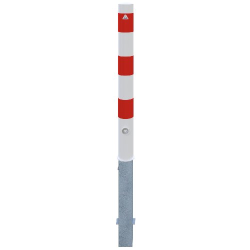 Absperrpfosten aus Stahlrohr Ø 89 x 2,9 mm für die klare Abgrenzung und Sperrung von Flächen. Der Pfosten ragt 900 mm über Flur und schließt oben mit einer aufgeschweißten Stahlkappe ab. Er ist herausnehmbar und wird über einen Dreikantverschluss nach DIN 3223 mit selbsteinrastender Verriegelung gesichert. Zum Einbau gehört eine Bodenhülse Typ 470.10, die ca. 500 mm unter Flur sitzt und den Pfosten aufnimmt und führt. Die Oberfläche ist feuerverzinkt und weiß beschichtet. Drei rot reflektierende Leuchtstreifen am Schaft erhöhen die Sichtbarkeit bei geringer Beleuchtung. Der Pfosten wird ohne Öse geliefert. Im verriegelten Zustand steht der Pfosten fest und bildet eine dauerhaft sichtbare Absperrung; bei entriegeltem Verschluss lässt er sich vollständig entnehmen, sodass die gesperrte Fläche kurzzeitig freigegeben werden kann. Die Ausführung mit Bodenhülse erlaubt einen dauerhaft eingebauten Aufnahmepunkt im Untergrund.