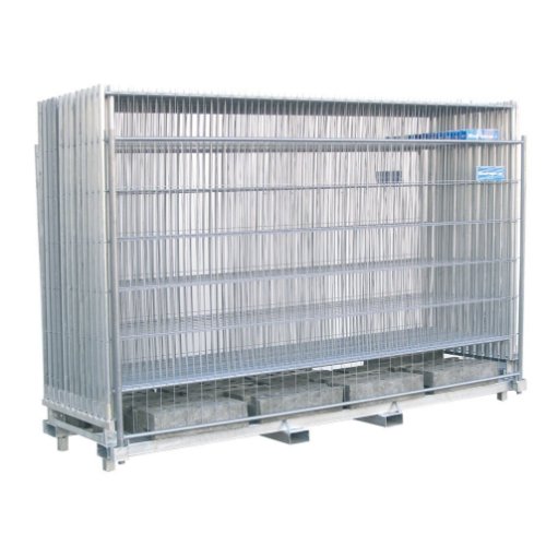 • Kombipalette für den Transport und die Lagerung von Mobilzaunelementen (3,50 m Länge) und Bauzaunfüße