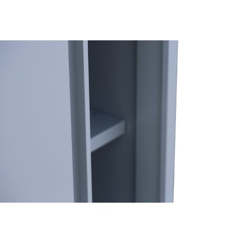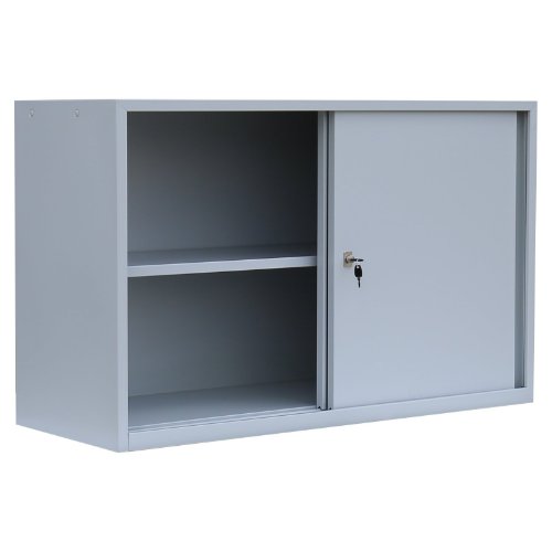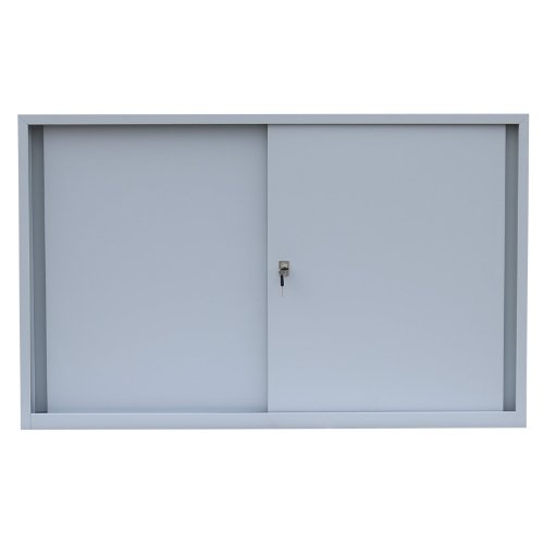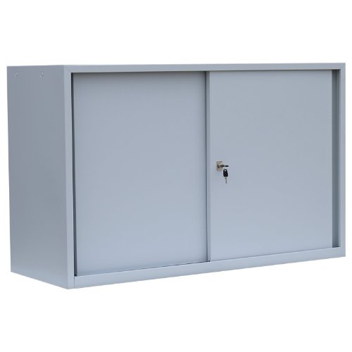 Schiebetürenschrank mit 1 Fachboden für 2 Ordnerhöhen. Stabile, geschweißte Stahlblechkonstruktion, senkrechte Kastenverstärkung zur Aussteifung der Türblätter. Schiebetüren schienengeführt auf Kugellagerrollen, geräuschdämpfende Anschlagspuffer. Verschliessbar durch Dreh-Druckzylinderschloss, inkl. 2 Schlüssel. Fachboden im Raster höhenverstellbar, 50 kg Tragkraft/Boden. Pulverbeschichtung: Korpus in RAL 7035 Lichtgrau, Türen in RAL 7035 Lichtgrau. Maße: H 750 x B 1200 x T 450 mm.