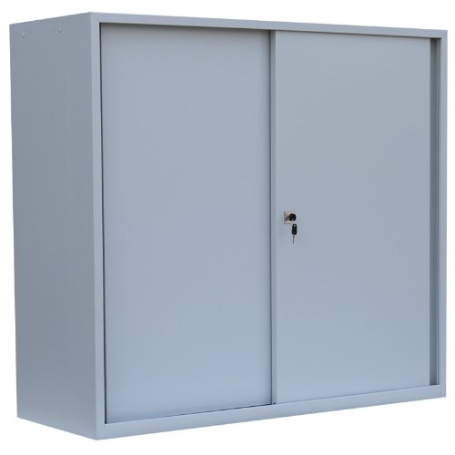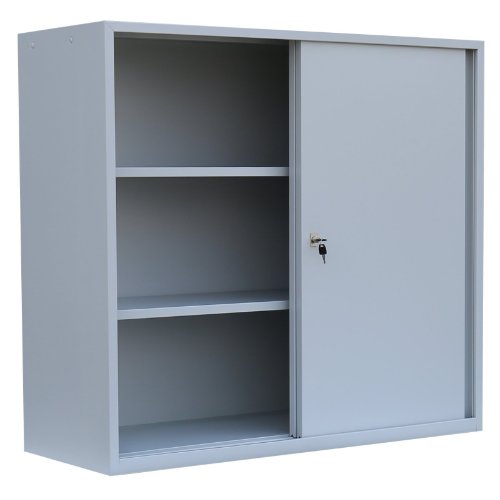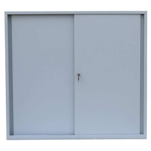 Schiebetürenschrank mit 2 Fachböden für 3 Ordnerhöhen. Stabile, geschweißte Stahlblechkonstruktion, senkrechte Kastenverstärkung zur Aussteifung der Türblätter. Schiebetüren schienengeführt auf Kugellagerrollen, geräuschdämpfende Anschlagspuffer. Verschliessbar durch Dreh-Druckzylinderschloss, inkl. 2 Schlüssel. Fachboden im Raster höhenverstellbar, 50 kg Tragkraft/Boden. Pulverbeschichtung: Korpus in RAL 7035 Lichtgrau, Türen in RAL 7035 Lichtgrau. Maße: H 1090 x B 1200 x T 450 mm.