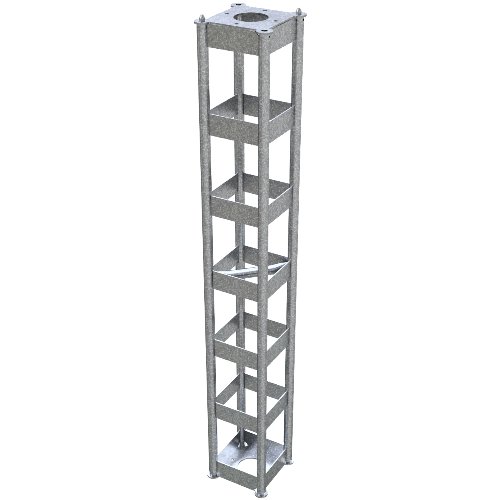 Das Mittelstück ist Bestandteil einer modularen Stahlkonstruktion und wird mit passenden Endstücken kombiniert. Die Ausführung ist verzinkt; die Beschichtung schützt die Oberfläche vor Korrosion. Die Elementhöhe beträgt 2,50 m. Die Länge steht in mehreren Varianten zur Verfügung und erleichtert die Anpassung an bauliche Gegebenheiten. Das Mittelstück ist für die Aufnahme hoher Lasten ausgelegt und überträgt Kräfte in das Gesamtsystem. Integrierte Zentrierzapfen erleichtern die Montage, stellen die lagerichtige Positionierung sicher und erzeugen eine wiederholgenaue Ausrichtung von Element zu Element. Die Verbindung erfolgt über Bohrungen in den Grundplatten, wodurch sich die Fügepunkte mit Schrauben oder Bolzen herstellen und bei Bedarf lösen lassen. Mehrere Mittelstücke können miteinander und mit den Endstücken zu durchgehenden Linien verbunden werden. Die Stahlkonstruktion unterstützt einen geordneten Aufbau vor Ort.