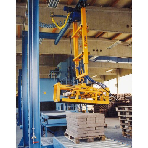 Bei Anfrage ist der Kranbahnträgertyp sowie die Hubhöhe anzugeben! Teleskopführung für stationäre Anlagen zur Aufnahme von Arbeitsgeräten (z. B. pneumatische Abtragezange, Wendezange o. ä.). Durch elektrischen Fahrantrieb und elektrischen Kettenzug Arbeitserleichterung speziell in den Bereichen Umsetzen von Pflastersteinanlagen (Stock- und Sandstrahlanlagen) oder manueller Paketierung von Betonprodukten in Verbindung mit dem entsprechenden Greifgerät. "