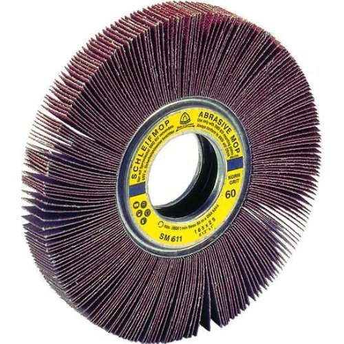 Schleifmop mit geraden Lamellen für die Feinbearbeitung von Oberflächen. Die fächerförmig, radial angeordneten Lamellen passen sich der Kontur des Werkstücks an. Profilierte Lamellen auf Anfrage lieferbar.