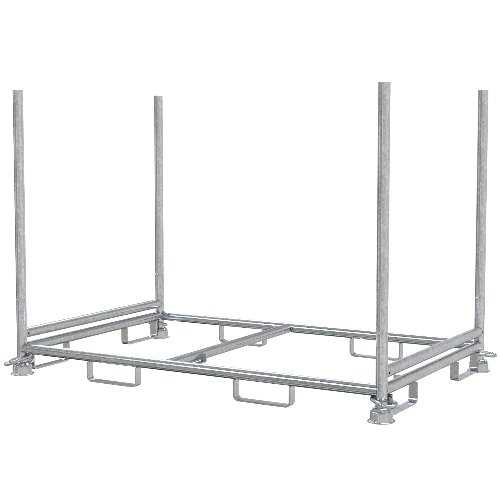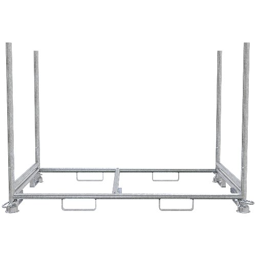 Diese Stapelpalette dient dem Transport und der Lagerung von Absperrschrankengittern. Die Gitter stehen auf erhöht angeschweißten Querholmen, sodass sie sauber aufliegen und ausgerichtet bleiben. Herausnehmbare Holme erleichtern Be- und Entladung und den Zugriff auf den Stapel; sie lassen sich bei Bedarf schnell entnehmen und wieder einsetzen. Acht angeschweißte Einfahrschuhe sorgen für sicheren Transport im innerbetrieblichen Verkehr; die Aufnahme erfolgt per Stapler, bei Bedarf auch im Kranbetrieb, sodass die Palette in bestehende Abläufe eingebunden wird. Das Füllmaß von 1,80 x 1,10 m bietet den benötigten Raum, die Holmhöhe von 1,34 m ermöglicht das Laden mehrerer Elemente innerhalb des Rahmens. Die konturgeformten Tulpenfüße erlauben ein standsicheres Übereinanderstapeln mehrerer Paletten und eine geordnete, platzsparende Lagerung. So bleibt die Ladung auch bei Fahr- und Hubbewegungen stabil geführt.