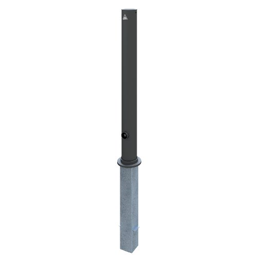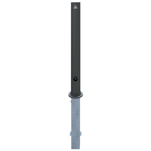 Der Stilpoller besteht aus einem Stahlrohr mit 89 mm Durchmesser und ragt etwa 950 mm über Flur. Die Oberfläche ist feuerverzinkt und anschließend in Anthrazitgrau (RAL 7016) beschichtet, was einen dauerhaften Korrosionsschutz im Außenbereich sicherstellt. Der Abschluss erfolgt mit Flachkopf. Der Poller ist herausnehmbar und wird über einen normgerechten Dreikantverschluss nach DIN 3223 bedient. Beim Einsetzen verriegelt die selbsteinrastende Mechanik automatisch; die Entnahme erfolgt mit dem passenden Dreikantschlüssel. Als Aufnahme dient eine feuerverzinkte Bodenhülse Typ 470.10, die bauseits im Fundament eingebaut wird. Bei entnommenem Poller verbleibt lediglich die Bodenhülse im Untergrund. Die Ausführung kommt ohne Öse, sodass keine Ketten- oder Gurtanschlüsse vorgesehen sind. Der Durchmesser von 89 mm bildet eine kompakte, gut sichtbare Sperre. Die Ausführung eignet sich für Bereiche, in denen Zufahrten oder Wege regelmäßig freigegeben und wieder gesperrt werden müssen, ohne einen festen Aufsatz zu hinterlassen, und sorgt für eine klare Abgrenzung im täglichen Betrieb.