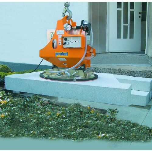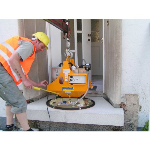 Bei Bedarf kann auch zusätzlich noch ein hydraulischer Drehkopf benutzt werden. Für das wirtschaftliche und sichere Handling von schweren Lasten bis 1.000 kg, wie z.B. Granitplatten, saugdichte Betonelemente, Marmorplatten, Bordsteine, Trittstufen, Rohren usw. Universell einsetzbar 1-Mann-Bedienung.