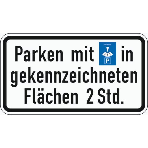 • VZ 1040-33 Parken mit Parkscheibe in gekennzeichneten Flächen 2 Stunden